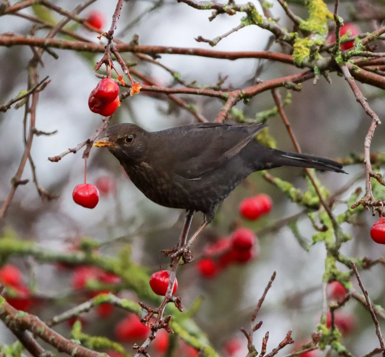 Falconer Jade has been using her photography skills to capture the numerous thrush species which have descended on our hedgerows to devour the berries. While Blackbirds, Mistle and Song Thrushes are present all year round, they have been joined by additional birds from Scandinavia of the same species, as well as Redwings and Fieldfares. Staff recently counted over 20 Blackbirds feeding on the berries. These birds will soon be migrating back to their home territories further north in preparation for upcoming spring and breeding season.